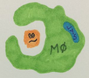 Once inside the body, the microorganism may encounter a macrophage (Mφ) that can bind to and ingest it (phagocytosis). Once this happens, the macrophage is termed active. Activated macrophages start to produce chemicals that will digest destroy the microorganism. These chemicals include: